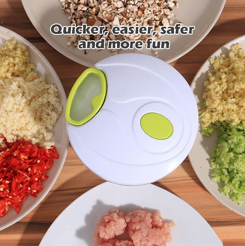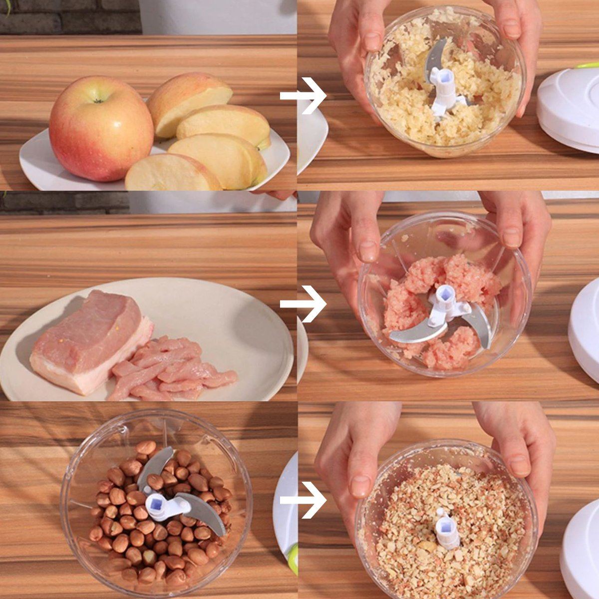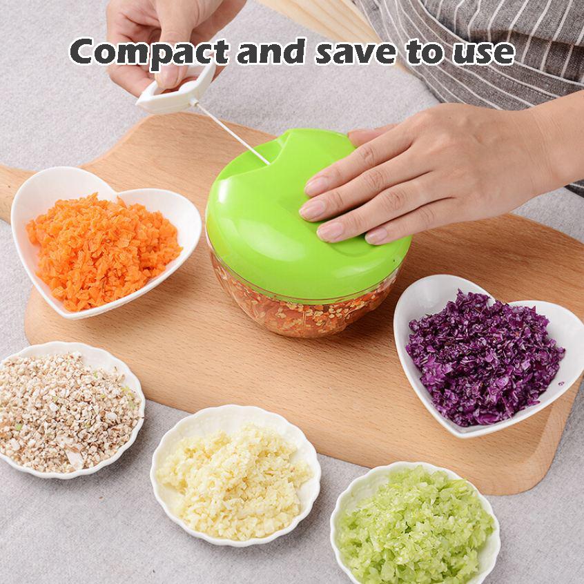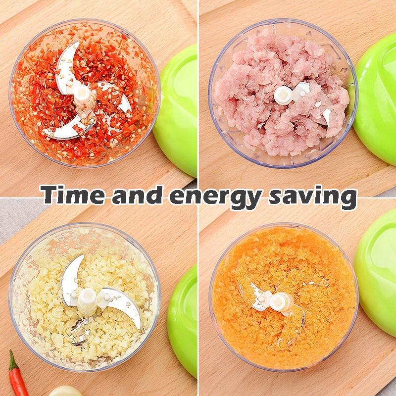 - Time and energy saving: No electricity needed which makes chopper more quieter and long life. Save much time in the kitchen. This speedy hand pull food chopper help you cut vegetable, fruits, onions, garlic, tomatoes, potatoes quickly with 3 Sharp blades.