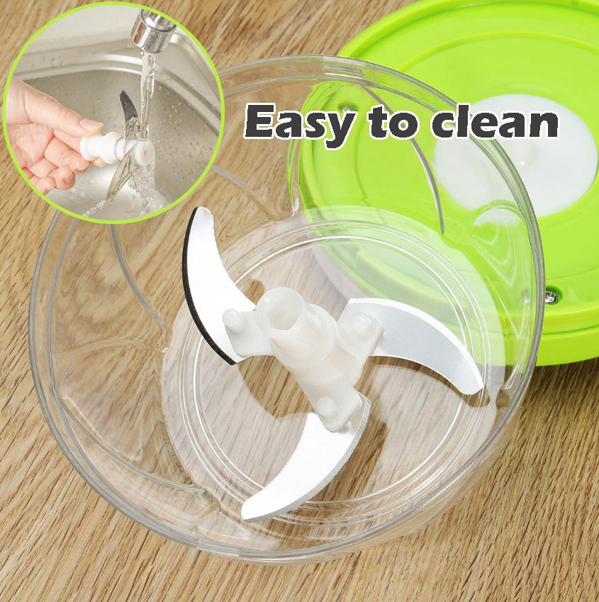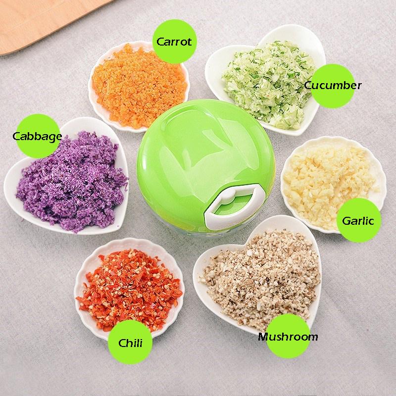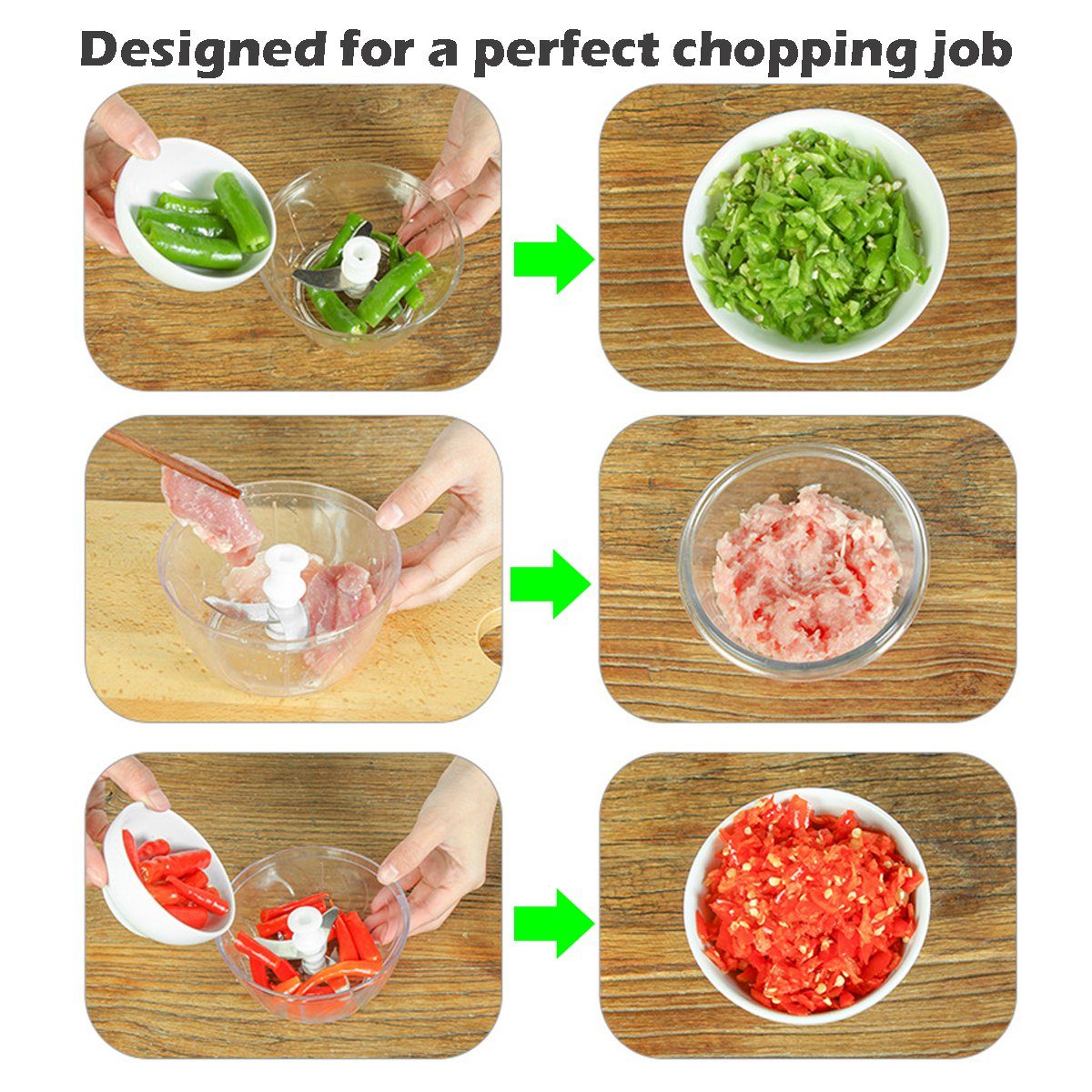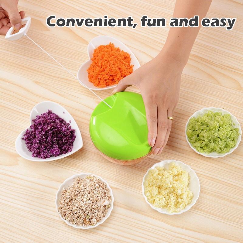 - Time and energy saving: No electricity needed which makes chopper more quieter and long life. Save much time in the kitchen. This speedy hand pull food chopper help you cut vegetable, fruits, onions, garlic, tomatoes, potatoes quickly with 3 Sharp blades.