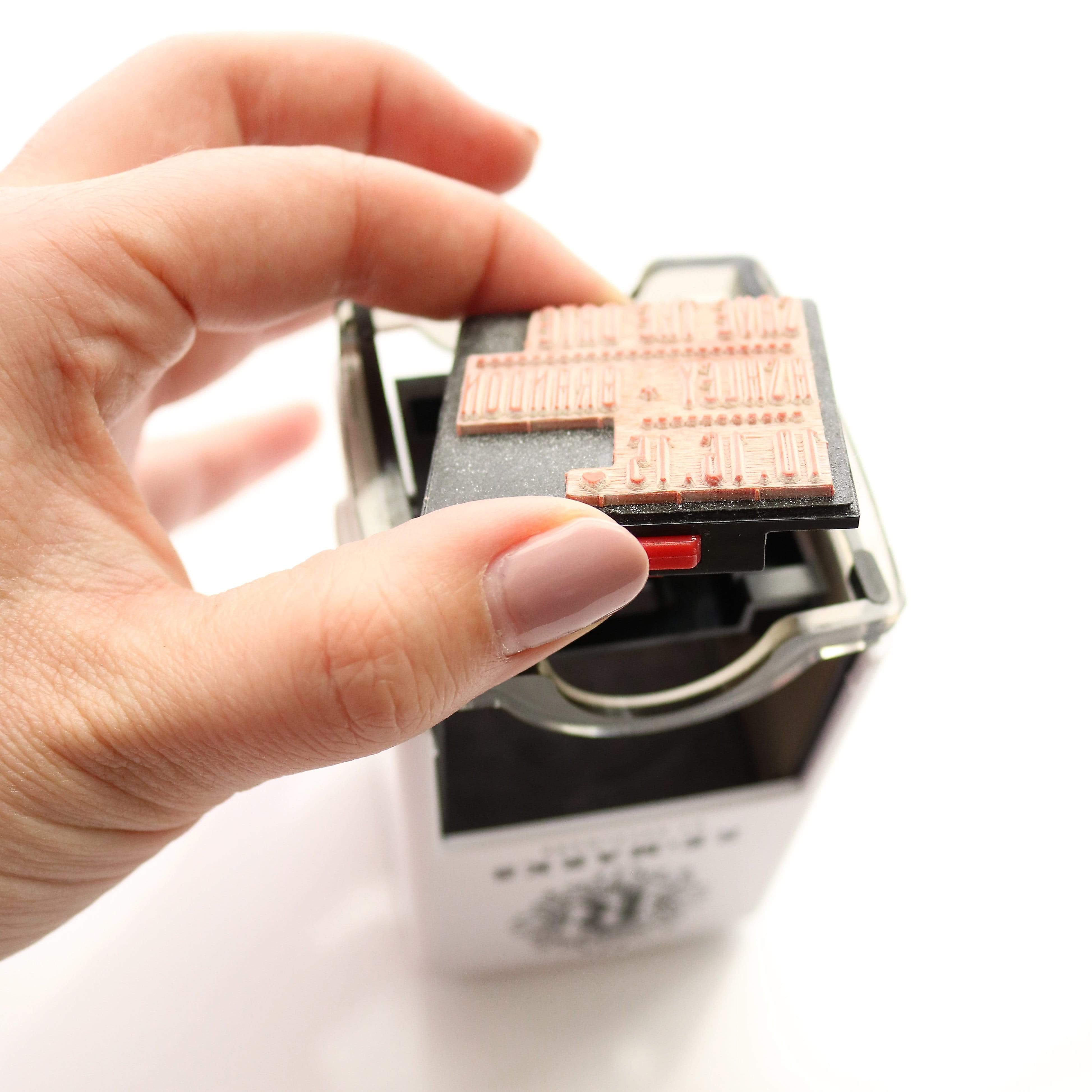These Re:Marks stamps save time and boost creativity. Quickly add your return address to envelopes, stationery, books, greeting cards, invitations and more! Featuring interchangeable die plate functionality, Re:Marks stamps allow you to create many different impressions with just one mount! The self-inking design automatically re-inks itself into a rotating, self-contained ink pad before each impression, making Re:Marks ideal for rapid, repetitive stamping.