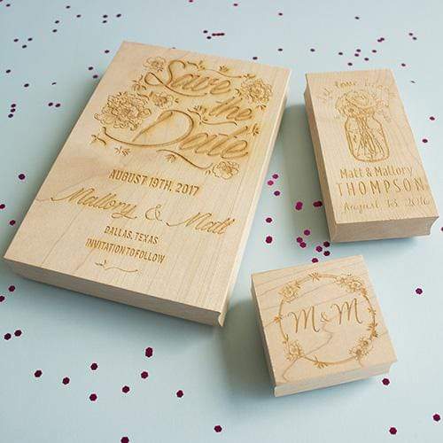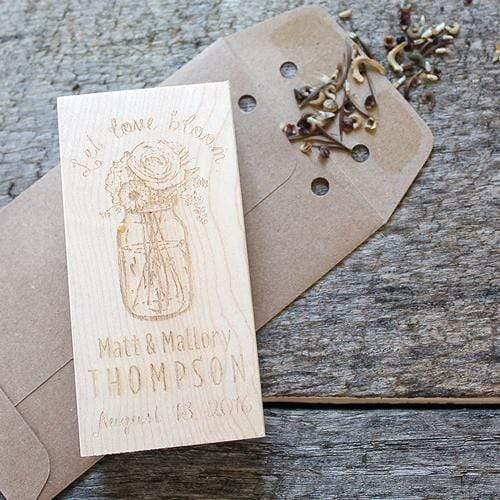 Let Love Bloom Custom Favor Stamp on a 4" x 2" rectangle engraved maple art mount. Requires separate ink pad.